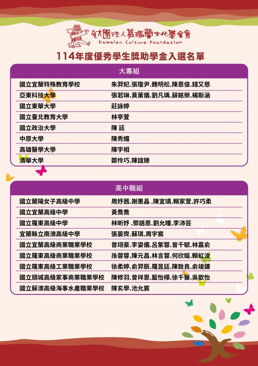 114年度宜蘭地區優秀學生獎助學金入選名單